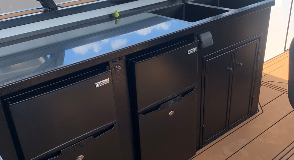 Meal preparation areas: come in a variety of colors with scratch resistant easy clean bench tops, and plenty of drawers and storage needs, The functional galley includes a Kenyon dual-burner cooktop, electric BBQ grill, Indel Webasto fridge/freezer combo, drawer fridge, and an integrated icemaker. All appliances are supported by Mastervolt inverters and batteries also run the coffee machine, and whatever else you need with ease, Sink with luxury tap, Pantry storage ability areas for food and items, includes an Electric grill BBQ attached to rear rails and extended bench table top ability for those big cook "off " family days out that extends your bench space 70% more, Led lighting strips under bench and in floor walk way lighting applies for night time stay overs and come in (Blue color) can be viewed at https://www.kenyonappliance.com
