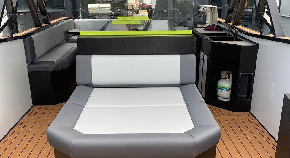 Helm and passenger seating are custom designed with detailed options for comfort and functionality. All seating features modern stitching and ample under-cushion storage. Optional upgrades include personalized embroidery and matching trims with personalized inbuilt name of the boat engraving into the trim on every seat area with comfortable modern contemporary designs and many under cushion storage areas........