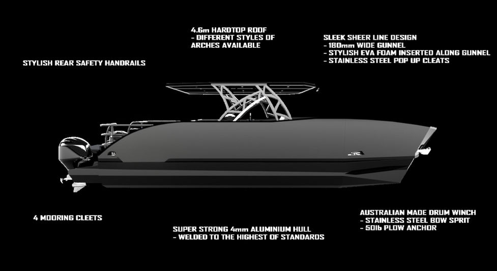 To be used as a sports fisher/Day Boat/Ski/Yacht tender as boat can be lifted and towed with ease with the on board lifting and tow points that are built into the hull frame that make this boat easy to use for a superyachts tender and also be towed using our tow rated hooks.(optional lowering roof is available extra cost and design changes apply)