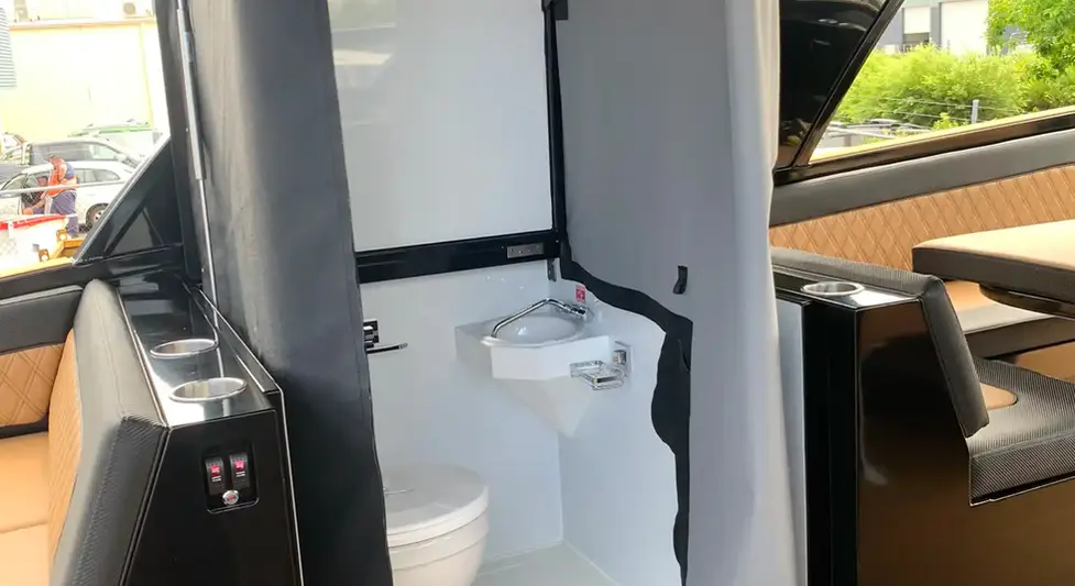 Shower/toilet/basin made and fitted with high end lightweight materials (electric hot water is included) Standard, to 7m / 8.5m/11m/12m/13m is an easy folding (Pop up type) on lifting hydraulic arms for easy usage (compact) as the Pop up change room acts as extra food prep area when folded down and has a 1” SS surrounding rail to stop items falling off in seas. and when in the up position, unzip the entry curtain to find a fully appointed change room/shower toilet and basin. We have a Bathroom upgrade available on models 11m, 12m,13m from the folding type as mentioned standard above in our ranges to a full size bathroom and is fitted at an Extra cost on top of the listed price for 11m, 12m,13m of upgrade cost of $7,500 us dollars, Our 14m boats have these upgrade bathrooms built into the pricing listed