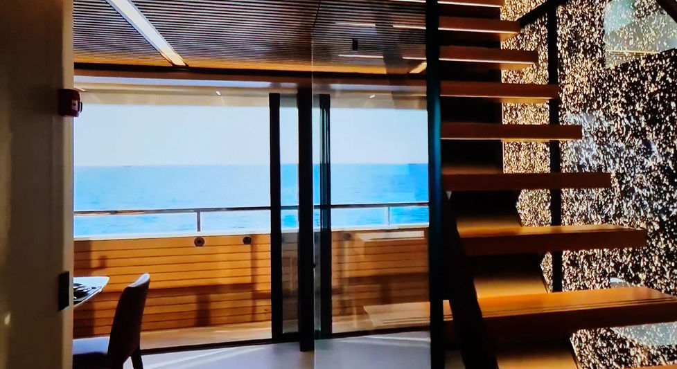 The electric power raise swim platforms/Balconies to each middle side areas of the boat extend over 2m wide and fold up when travelling to give added sea protection when underway and have swim ladders and balcony rails with black poles and ropes for balustrading needs (Great for sun tanning areas and extra social dinning needs